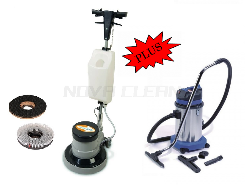 Cena zahŕňa jednokotúčový stroj Floor W 16-1200 vrátane kompletného príslušenstva: stroj, nylonová kefa, kobercová kefa, unášač padu, nádoba na roztok + Priemyselný mokro-suchý vysávač VCL 30 ST v plnej výbave, ktorá zahŕňa 2,5 saciu hadicu s koncovkami, sacie potrubie, podlahová hubica na vysávanie suchých nečistôt, tvrdých podláh ako aj kobercov, podlahová hubica na vysávanie vody, štrbinový nadstavec a okrúhla kefka.
